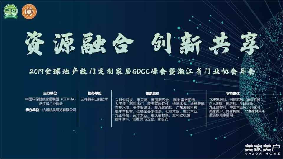 资源融合,创新共享!打造全球板门定制家居设计生态圈!2019年11月1日,2019全球地产板门定制家居GDCC峰会暨浙江省门业协会年会于中国浙江德清莫干山开元森泊酒店盛大召开。本届峰会由中国环保健康家居联盟(CEHHA)、浙江省门业协会主办,云峰莫干山科技木协办,杭州航昊展览有限公司承办。峰会的盛大举行得到了立邦长润发、康贝德、雅丽斯五金、德硅·雷诺丽特、大宝漆、志邦木门、数夫家居软件、维德木业、涂鸦智能、吉复水漆、新念智能锁、广东海顺科技、福羊羊板材、佳德宝曼水性漆、七彩木皮、张传银设计、艺北木业、九正建材网、远洋木业、崔氏密封条、意利欧机械、宣伟涂料、诺维索玛极简门锁、家倍安等企业的大力赞助。并得到全国多家协会的大力支持。TOP家居网、网易家居、新浪家居、点讯传媒、家居邦、今日头条、九正建材网、中国木业网、齐家网、美家美户、好家传媒、77度家具头条、搜狐焦点家居网等行业主流媒体进行全方位现场报道。本届论坛主题为“资源融合,创新共享”,旨在通过汇聚融合创新资源,进一步加强定制家居产业链各企业间的合作,推动定制家居产业链的结构延伸,以及产业转型升级。数百家中外企业、定制家居、全屋定制、板材企业及上下游供应链企业,近百个高新技术项目参与,展示定制家居创新设计、环保升级、信息技术、跨界黑科技等,领先企业发展的先进技术以及产品。