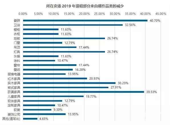 数据显示,瓷砖、欧美家具品类减少最多,卫浴、实木家具紧随其后,板式家具、地板和灯具品类退租也较多。而软装、定制类退租率最低。