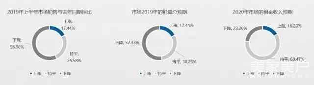 与2018年同期相比,2019年上半年,56.98%的企业销售额呈现下降,上涨的企业仅占17.44%。对于2020年市场租金收入预期,6成卖场表示预计和2019年持平,仅16.28%的卖场预计租金收入会上涨。
