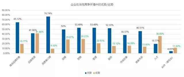 调查显示,企业的竞争优势绝大部分源自商场品牌形象和当地消费者口碑,而竞争劣势则更多源自人才短缺、品牌资源,此外,营销能力也是一大因素。