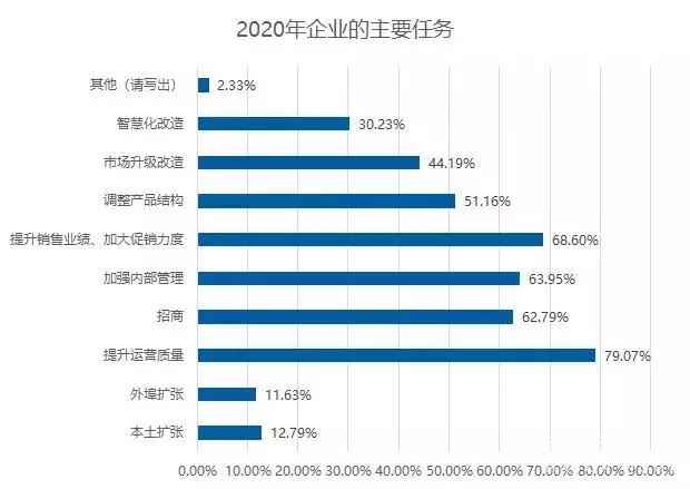 2020年,60%以上的企业认为,提升运营质量、提升销售业绩、加大促销力度、加强内部管理和招商是主要任务。可见,绝大部分企业还是更倾向于提升运营、管理和营销能力。