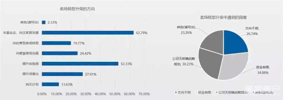 关于卖场转型升级的方向,62.79%的企业选择了丰富业态,向泛家居发展;52.33%的企业认为要提升消费者体验感。同时,有5成以上的企业,在转型升级中方向不明或公司还没有明确的战略规划。