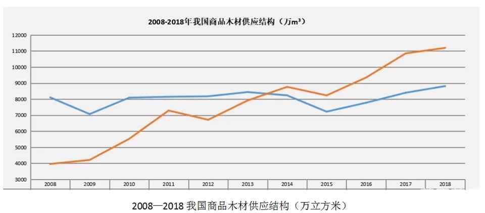 1.2 2008年—2018年,我国商品木材贸易量由1.2亿立方米增加到2亿立方米,其中国产商品木材供应量由8108万立方米增加到8811万立方米,年平均增长0.76%;进口商品木材供应量由3959万立方米增加到11196万立方米,年平均增长9.91%;2014年我国进口木材首次超过国产木材,进口木材供应持续增长,国产木材供应保持稳定。