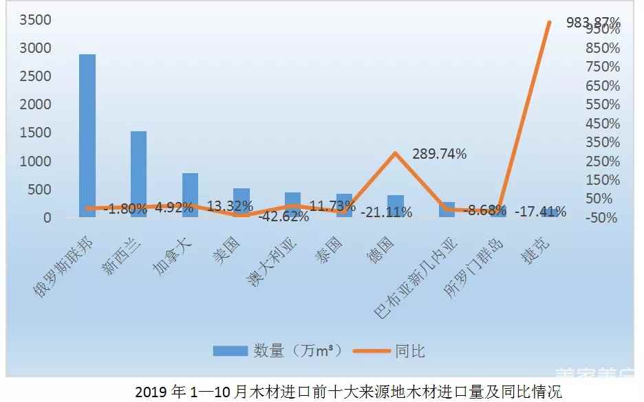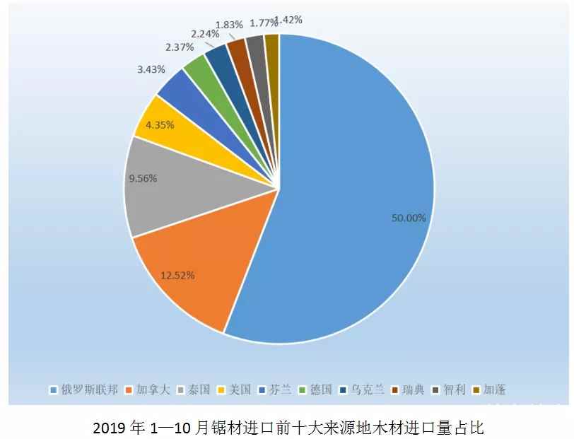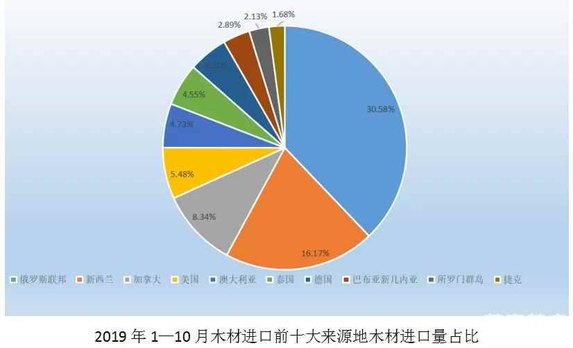 1.3.1 我国木材进口前十大来源国占木材进口总量的80.75%,依次分别为:俄罗斯联邦、新西兰、加拿大、美国、澳大利亚、泰国、德国、巴布亚新几内亚、所罗门群岛、捷克。其中,俄罗斯木材占我国木材进口总量的30.58%。2019年受欧洲风暴材与虫害材入市的影响,1-10月来源于捷克和德国的木材出现爆发式增长,也冲击了其他国木材贸易。预计,欧洲风暴材和虫害材在未来1-2年内仍将影响国际木材贸易格局。