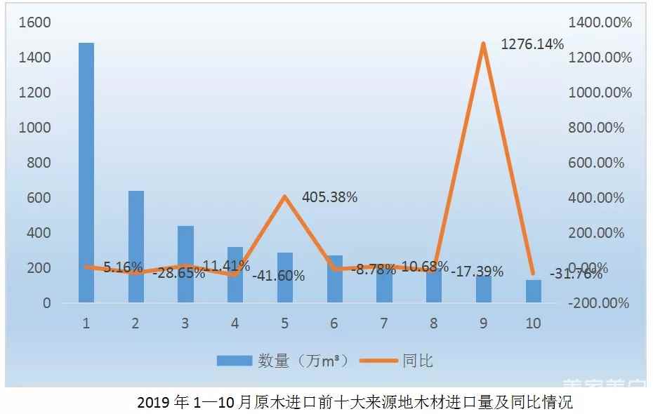 1.3 2019年1月—10月,我国木材进口总量同比小幅增长,进口量(原木材积)为9429.27万立方米,同比增加0.15%。其中原木进口4946.42万立方米,同比减少1.58%;锯材进口3156.93万立方米(原木材积计4482.84万立方米),同比增加2.13%。1—10月,针叶材与阔叶材进口比重为3:1,其中针叶材进口持续增长,阔叶材进口明显下降。进口针叶材7003.84万立方米,同比增长9.32%,进口额同比下降1.06%,进口均价下降近10%。阔叶木进口2425.44万立方米,同比减少19.39%,进口额同比下降28.57%,进口均价下降11.39%。