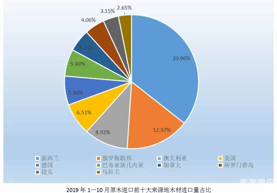 1.3.2 1-10月,我国进口针叶原木3641.99万立方米,同比增长5.45%,进口额同比下降2.89%;进口阔叶原木同比减少17.06%,进口额同比下降27.14%。原木进口量有所回落,针叶原木进口增幅收窄,阔叶原木下降明显。我国原木进口前十大来源国占原木进口总量的84.12 %,依次分别为:新西兰、俄罗斯联邦、澳大利亚、美国、德国、巴布亚新几内亚、加拿大、所罗门群岛、捷克、乌拉圭。其中,新西兰原木占我国原木进口总量近30%。