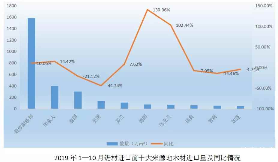 1.3.3 1-10月,我国进口针叶锯材2367.5万立方米,同比增长13.8%,进口额同比增长1.04%;进口阔叶锯材789.44万立方米,同比下降21.9%,进口额同比下降30.05%。我国锯材进口前十大来源国占锯材进口总量的89.49 %,依次分别为:俄罗斯联邦、加拿大、泰国、美国、芬兰、德国、乌克兰、瑞典、智利、加蓬。其中,俄罗斯锯材占我国锯材进口总量的50%。德国、乌克兰锯材贸易出现翻倍增长。受国内橡胶木市场需求疲软的影响,1-10月从泰国进口锯材下降较为明显。今年针叶材进口保持增长的主要原因是,国内基建投资稳步增长。而阔叶材进口增速下降明显,主要是受房地产市场低迷、家具类市场需求不足的影响。