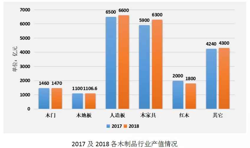 2018年,其他木制品由中高速发展进入高质量发展趋势明显,其中木家具产值稳步增长,木家具企业超8万家,从业人员约有500多万,木家具产值同比增长6.31%。木门产值达1470亿元,小幅增长。木地板产量下降但产值略有增长,其中木竹地板产量为7.89亿平方米,产值达1106.6亿人民币。