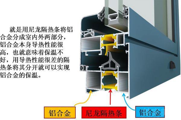 - 断桥铝门窗的是指铝型材,型材是两侧是铝型材中间是用尼龙的隔热条连接。