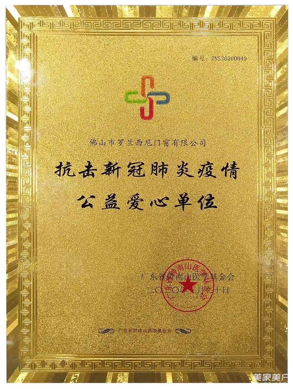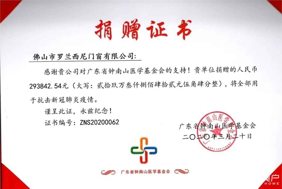 2020年2月6日,罗兰西尼门窗发起了公益捐助活动。由董事长熊志斌亲自挂帅,发起爱心捐款,支援疫情,短短24小时,共募集善款293842.54元。2月7日,罗兰西尼门窗向广东省钟南山医学基金会捐出所筹集的293842.54元善款,用于抗击新冠肺炎疫情一线医护人员的救助和医疗防护物资采购。