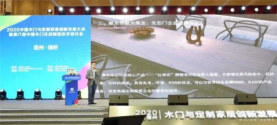 2020年10月17日,2020中国(宿州)木门与定制家居创新发展大会暨第六届中国木门先进制造技术研讨会,在安徽宿州隆重开幕,耀东华公司董事长曾敏华先生受邀出席,作《高端饰面人造板助推高端定制和生态门业发展》主题报告,并参与嘉宾访谈,分享耀东华公司在围绕产业高质量发展与产业链协同创新方面的实战举措和实践经验。