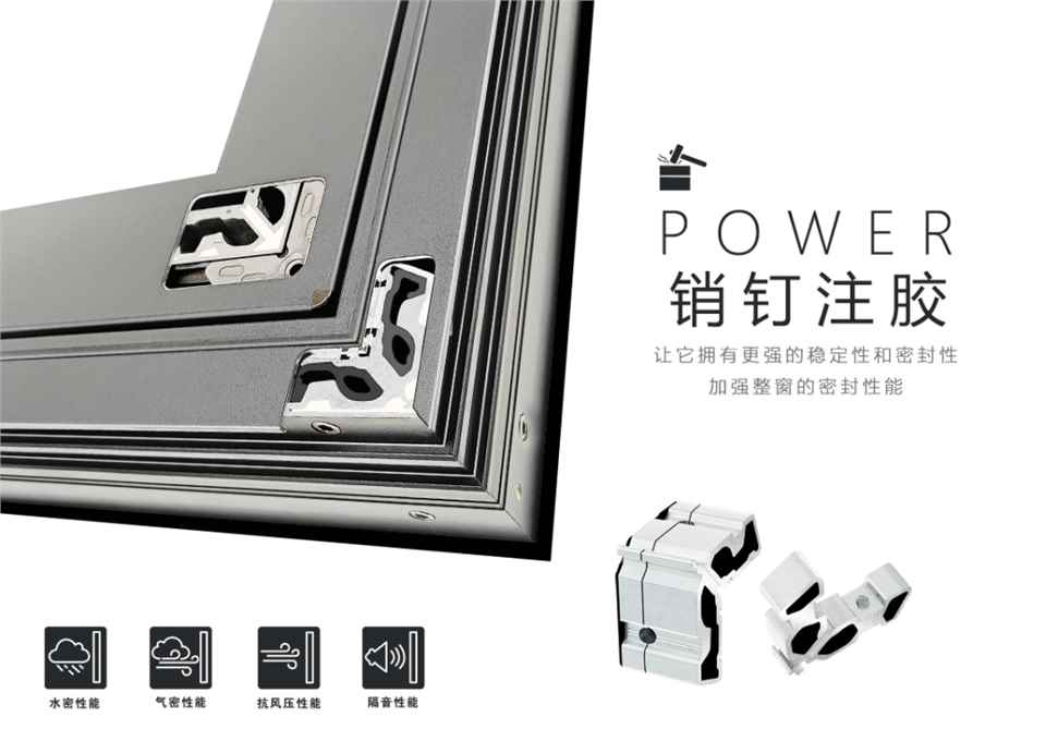 销钉角码具有自动调平型材功能,注入式双组份胶的工艺制作,更好填满间隙,保证密封性和强度。内外平框的设计缝隙小有利于密封。从着重点升级,避免窗户漏风的可能性。