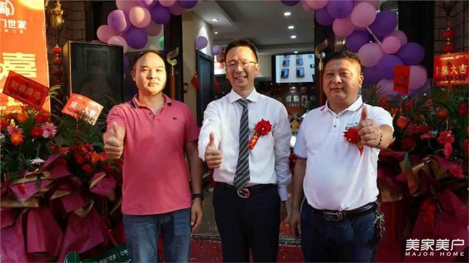 ▲福临门世家智能家居有限公司董事长梁晓东(中)、福临门世家门窗信丰旗舰店总经理钟勇(右)与信丰县五金商会会长王志辉(左)