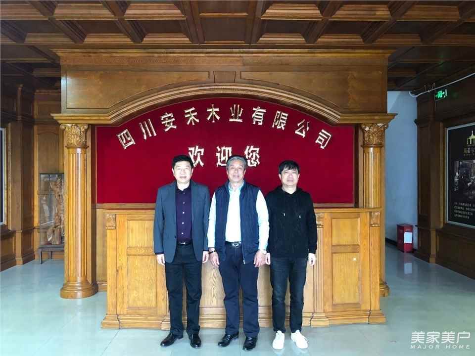 重庆市木门行业协会秘书长梁天顺(右)、副会长蒋桦松(左)与四川安禾木业(重庆富安)总经理、协会副会长胡安文(中)合影