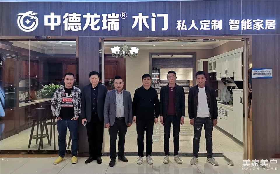 重庆市木门行业协会秘书长梁天顺(右三)、副会长蒋桦松(左二)与中德龙瑞总经理、协会会员周正全(左三)合影
