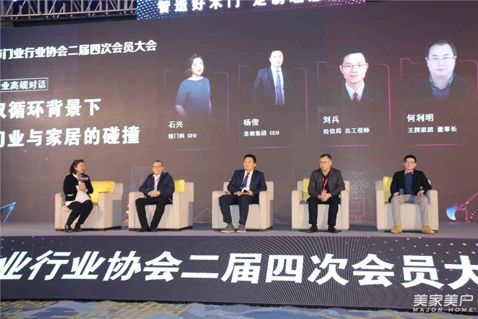 《双循环背景下,门业与家居的碰撞》行业高端对话,由搜门网CEO石兴主持,皇朝集团CEO杨俊、江山市经信局总工程师刘兵、王牌家居董事长何利明、豪德数控总经理刘敬盛,就江山木门与家居产业发展进行了真诚对话。