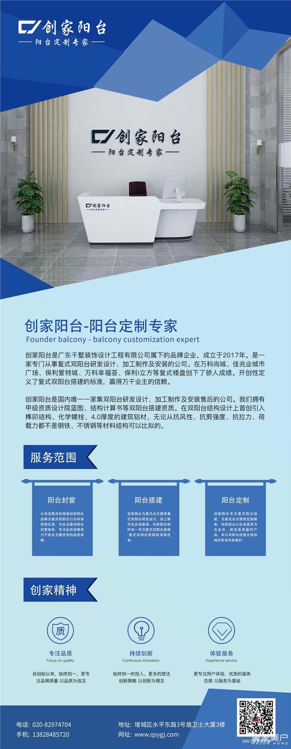 创家阳台成立于2010年,隶属于广东千墅装饰设计工程有限公司,是一家专业从事复式双阳台研发设计、加工制作及安装的企业。创家阳台开创性地定义了复式双阳台搭建的标准,拥有甲级资质设计院蓝图、结构计算书等双阳台搭建资质,在双阳台结构设计上率先引入榫卯结构、化学螺栓、4.0厚度的建筑铝材,其从抗风性、抗剪强度、抗拉力、荷载力都不是钢铁、不锈钢等材料结构可以比拟的。创家阳台是国内唯一集双阳台研发设计、加工制作及安装售后于一体的企业。创家阳台已赢得万千业主的信赖,在万科尚城、佳兆业城市广场、保利爱特城、万科幸福荟、保利i立方等复式楼盘的建设中都有不俗的表现。