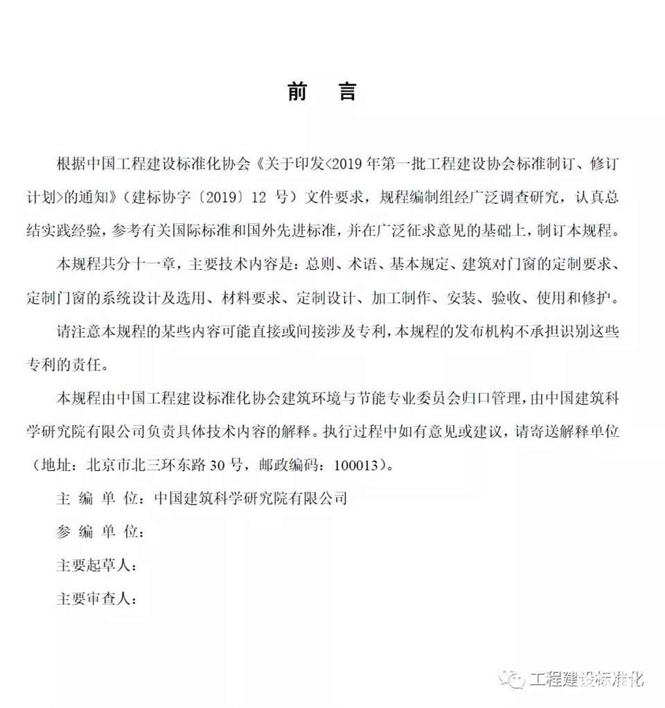 根据中国工程建设标准化协会《关于印发<2019年第一批工程建设协会标准制订、修订计划>的通知》(建标协字〔2019〕12号)文件要求,由中国建筑科学研究院有限公司牵头制订的中国工程建设协会标准《定制门窗工程技术规程》已完成征求意见稿。