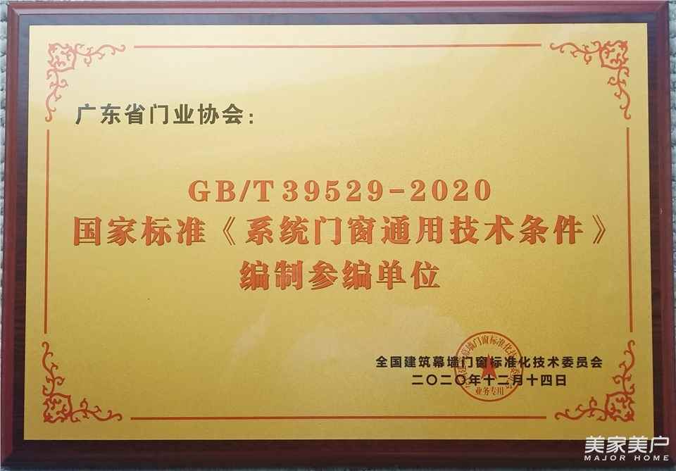 广东省门业协会获“国家标准 GB/T 39529-2020《系统门窗通用技术条件》”编制参编单位殊荣