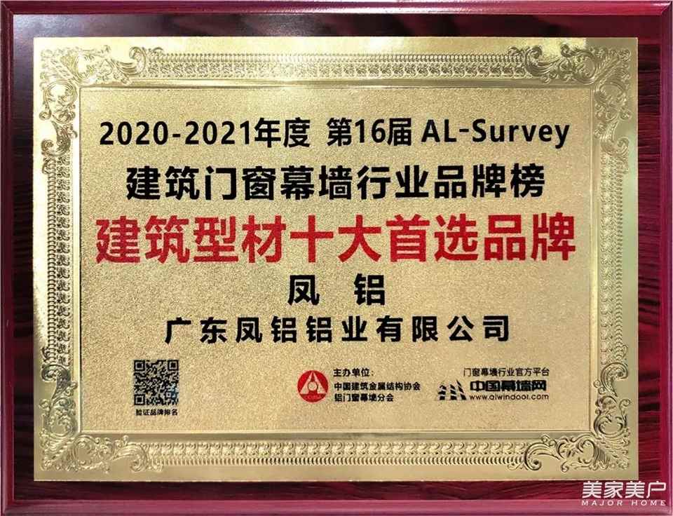 在中国建筑金属结构协会主办,中国幕墙网承办的“2020-2021年度第16届AL-Survey门窗幕墙行业年度大型读者调查暨‘我最喜爱幕墙工程’评选活动”(以下简称“AL-Survey”)中,凤铝凭借深厚的品牌沉淀和近年来稳健的市场增长,荣获“建筑型材十大首选品牌”(铝型材类)评选第一名。据悉,该评选自2005年创办以来,逐渐成为了部分房地产开发商、设计院以及行业专家、顾问咨询公司等群体,进行品牌选择和产品选购的重要参考依据之一,客观反映了行业品牌在2020-2021年度的运营与发展状况!