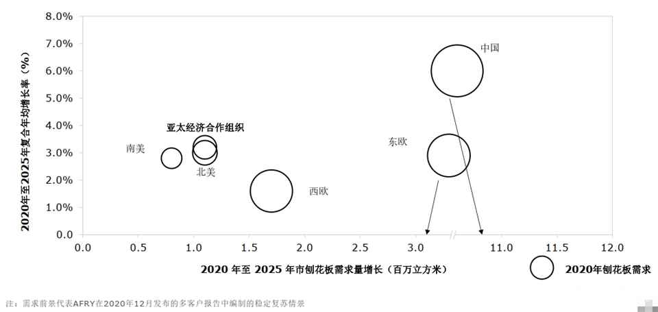 除中国外,受工厂临时停产的影响,2020年刨花板产量和市场需求按地区下降了-2%至-5%(新冠疫情)。