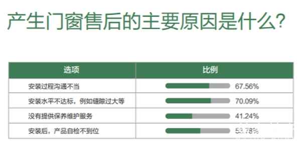 但是,在行业迅速发展,产品质量日渐提升的同时,门窗安装服务因高度依赖人工完成,无法统一标准,导致了作业水平层次不齐,安装不到位,给消费者带来了不好的服务体验。有调查显示,52%的消费者在门窗使用过程中遇到过漏风漏雨、门窗变形等问题。