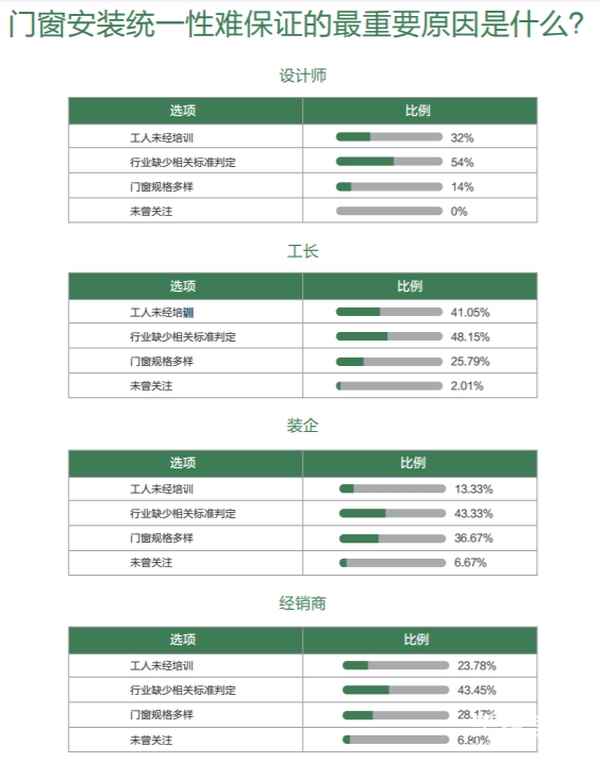 从设计师到工长、装企、经销商,都认为门窗安装统一性难保证,首要原因是“行业缺乏相关标准判定”,其次才是“工人未经培训”、“门窗规格多样”。同时,参与调研者非常认同门窗安装标准化、流程化带来的积极影响,希望通过科学培训,严格规范,解决因安装不当带来的安全隐患,保护工人施工安全;通过规范作业,提升门窗隔音隔热等性能实现,延长门窗使用寿命,提高门窗颜值。