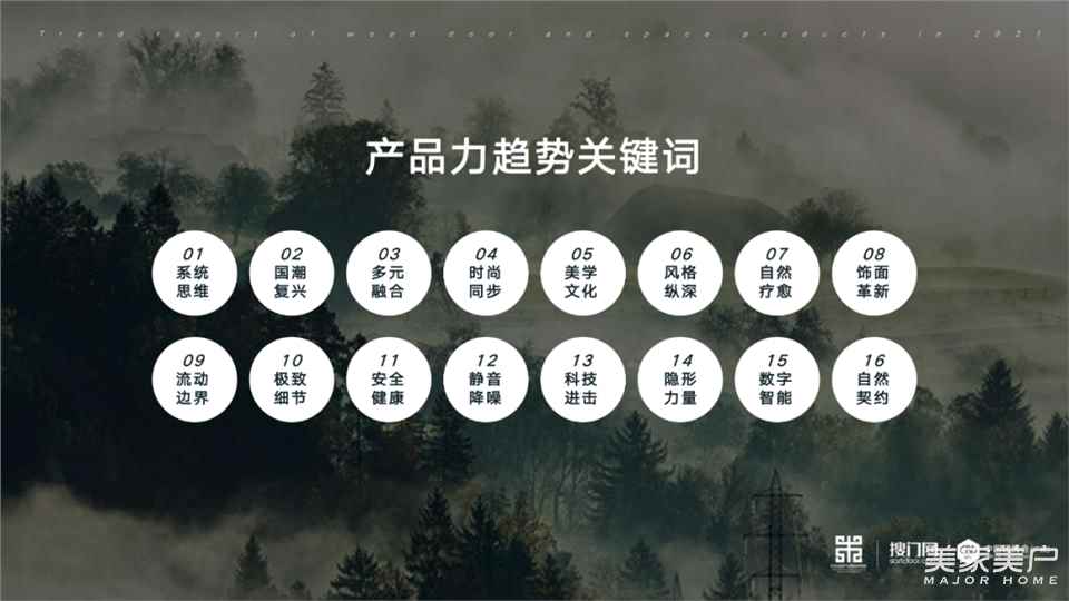 自从3月产品力项目启动以来,搜门网创设中心团队成员搜集、汇总国际国内关于木门、木作及供应链行业产品的具体案例和发展趋势,整理、提炼出16个关键词,来对整个行业进行总体的概括,由此形成的《2021年木门及空间木作产品力趋势报告》,于7月19号中国建博会(广州)第十届木门+产品大会上进行发布。