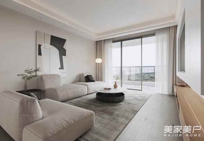 大面积的落地窗将柔和自然光引入室内,纯色的家具与窗外绿植相互呼应,让整体居家环境变得更为丰盈多元,生机勃勃。