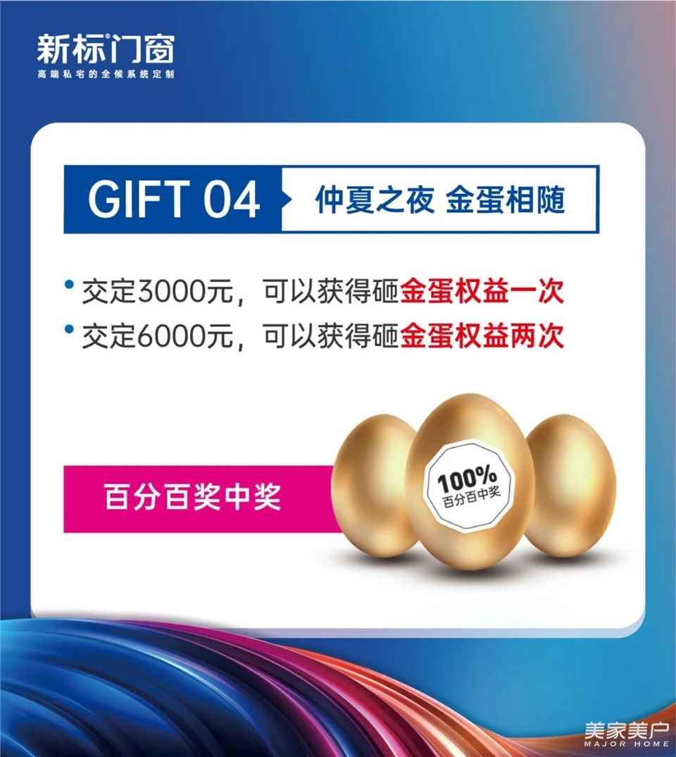 豪礼不间断,精彩不停歇,到店交定3000元,可获得1次砸金蛋机会,交定6000元,获得2次砸金蛋机会,百分百中奖,众多家装豪礼已准备就绪,助你省钱焕新家。