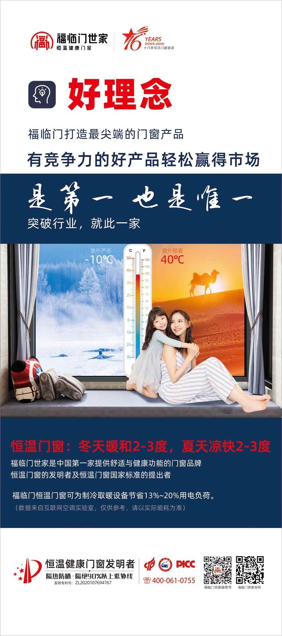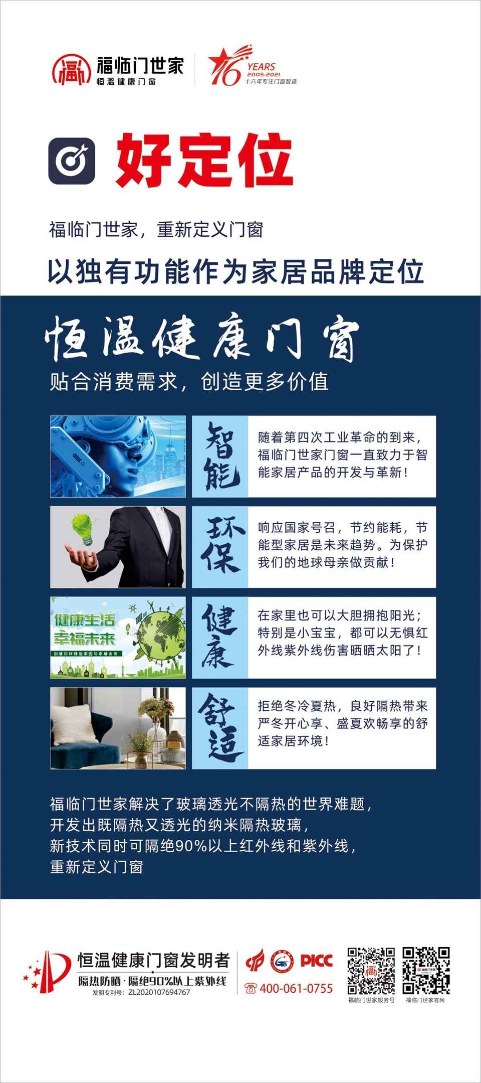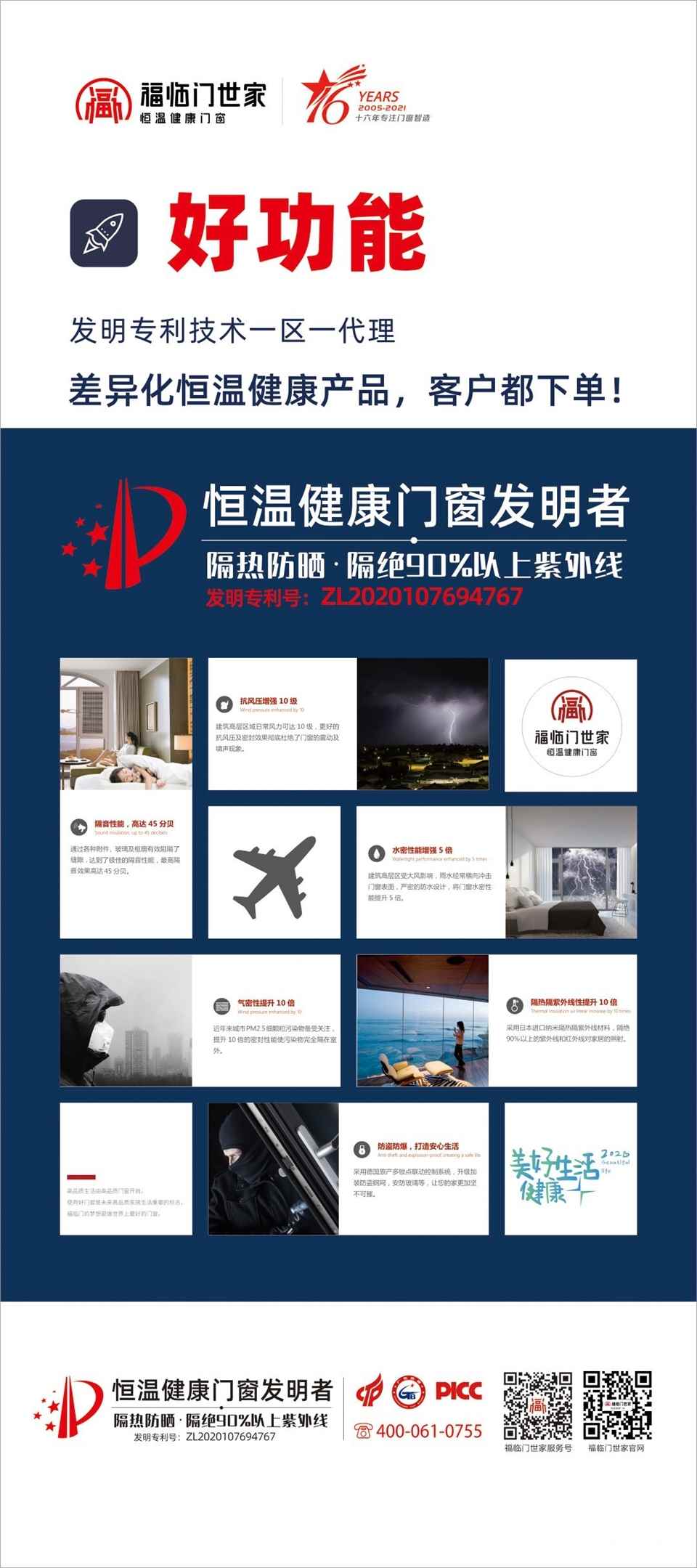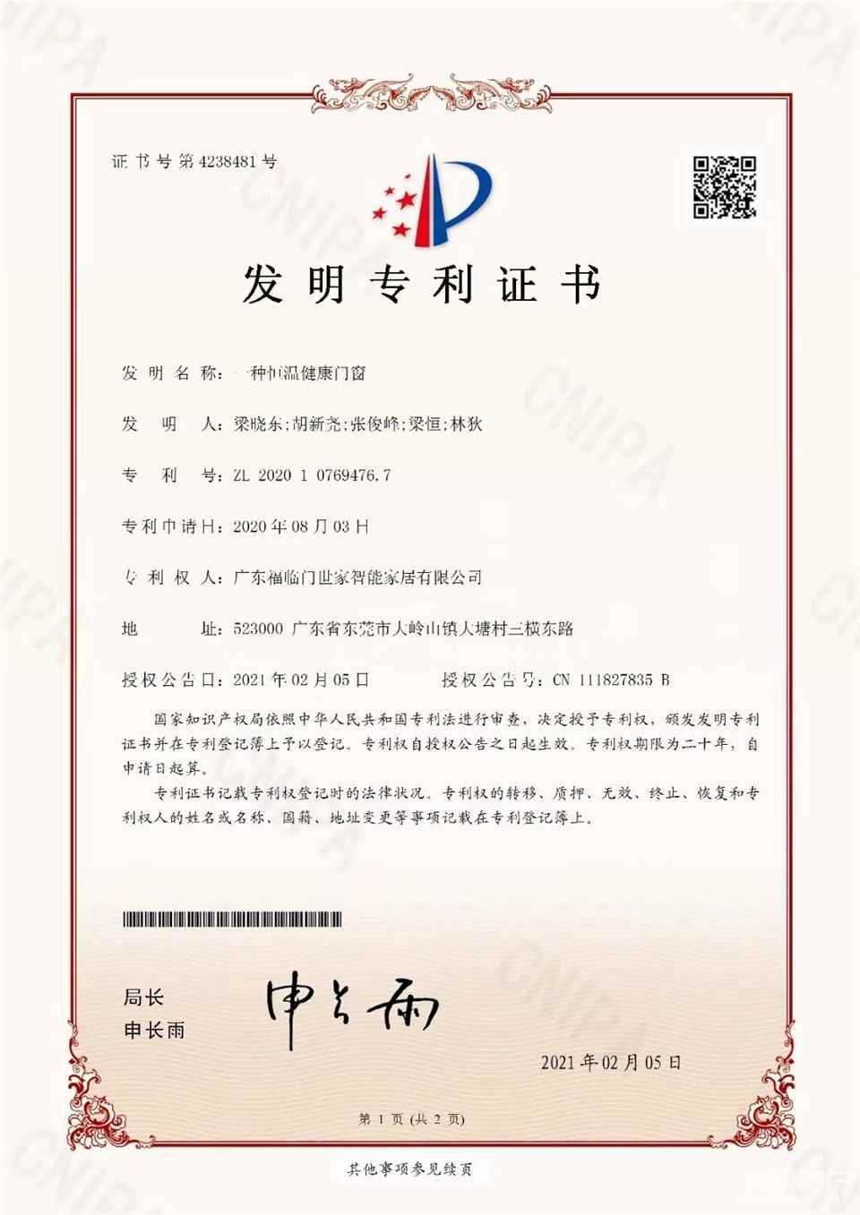 福临门世家恒温健康门窗——集福临门世家制窗工艺的大成之作,在原有断桥铝门窗研发制造基础上,进一步升级产品技术,创新窗户品类,并通过国家专利局审查,荣获国家发明专利!