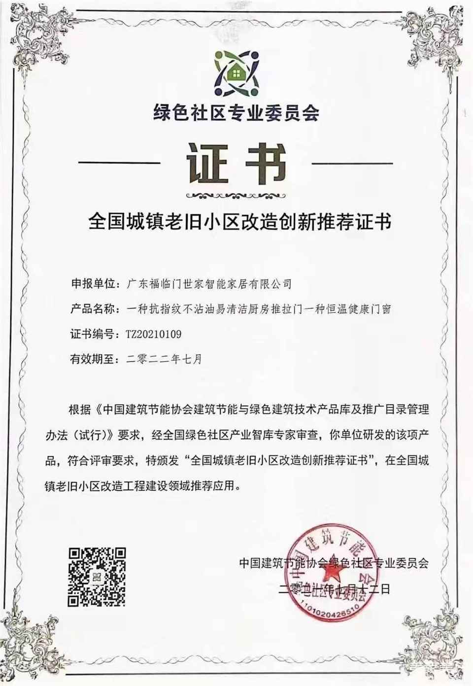 福临门世家旗下一种抗指纹不粘油易清洁厨房推拉门、一种恒温健康门窗获得“全国城镇老旧小区改造创新推荐证书”。