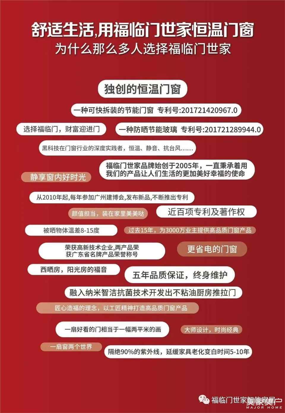 广东福临门世家智能家居有限公司是集研发、设计、生产、销售、服务于一体的定制门窗专营企业,也是高新技术企业。产品荣获广东省名牌产品称号,还获得PICC中国人民财产保险承保,是全球智能恒温门窗倡导品牌,恒温门窗的发明者及恒温门窗国家标准的提出者。