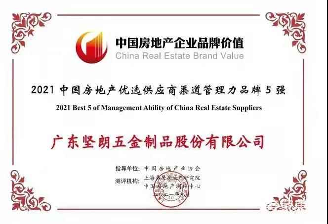 坚朗五金荣获“2021中国房地产优选供应商渠道管理力品牌”。