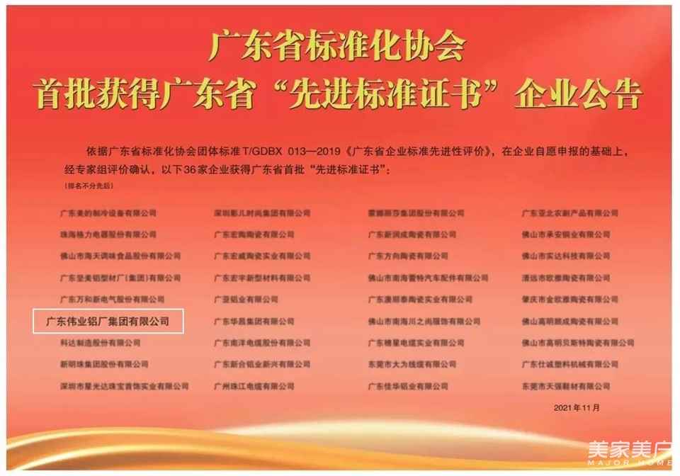 有标可依,以标准创造美好铝生活去年,伟业集团主导的《铝型材表面处理污水控制与处理技术指南》、《铝合金家居 柜类通用技术条件》标准,通过广东省标准化协会专家组认定,首批获得先进标准。而本次进一步获得广东省首批先进标准证书企业,更是对伟业集团标准化体系建设工作的肯定。