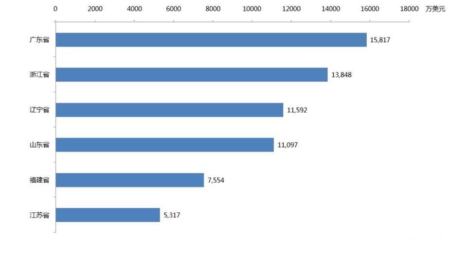 出口额排名前六位达到5000万美元以上的省份依然是:广东省、浙江省、辽宁省、山东省、福建省、江苏省。与去年同期相比,广东省增长21.2%,浙江省增长16.54%,辽宁省增长5.81%,山东省增长26.89%,福建省增长22.5%,江苏省增长42.11%。