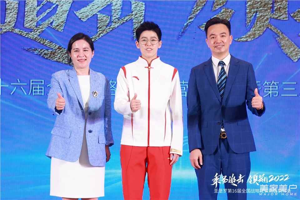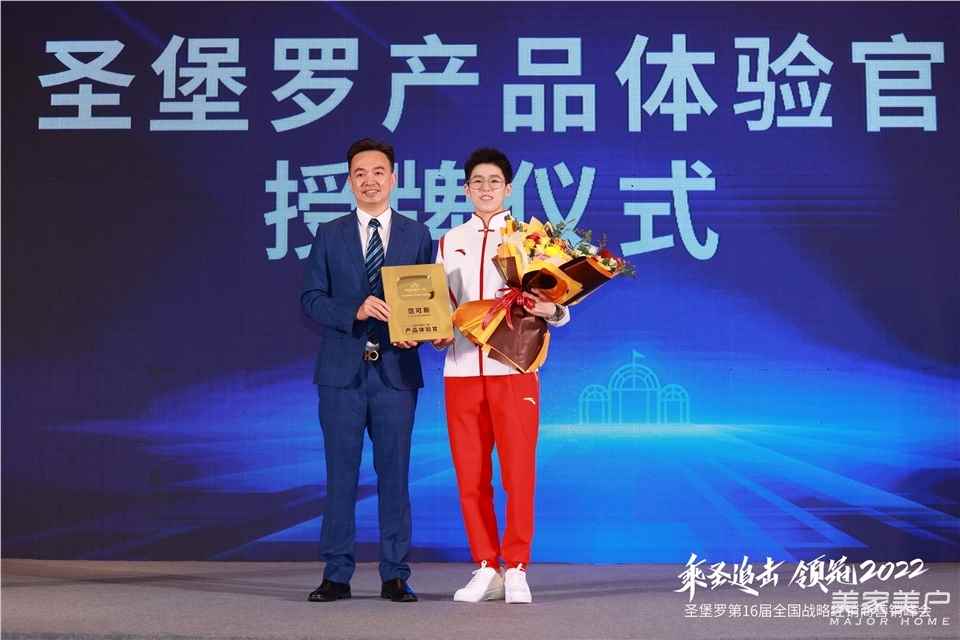 圣堡罗家居集团董事长吴国洪为产品体验官—2022年北京冬奥会短道速滑冠军范可新进行授牌。范可新亲临现场,与嘉宾共话《冠军之选,安全焕新》论坛并参与《冠军风范,品质新选》19800套餐活动官宣仪式,将大会推向新高潮。