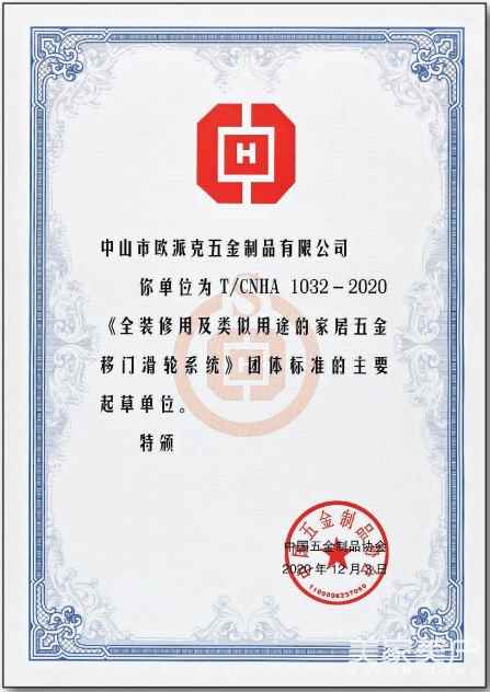 2017年,欧派克主起草发布中国家居五金团体标准《家居五金移门滑轮系统》,超越欧洲标准8项,填补国内外空白9项。2020年联合万科、采筑一起主导起草发布的T/CNHA 1032-2020《全装修用及类似用途家居五金移门滑轮系统》标准,推进了家居移门滑轮系统的各项测试更加全面科学普及执行。