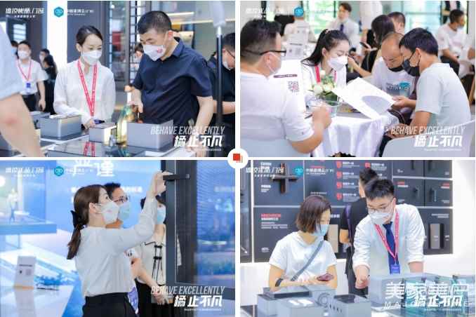 德技优品展馆结合VI系统的橘红色与黑白灰色调,在400㎡的空间里展示了众多的新技术、新产品、新形象。身穿统一制服的德技优品工作人员穿梭其中,专业地为参观者介绍展品、技术优势和成品交付系统。