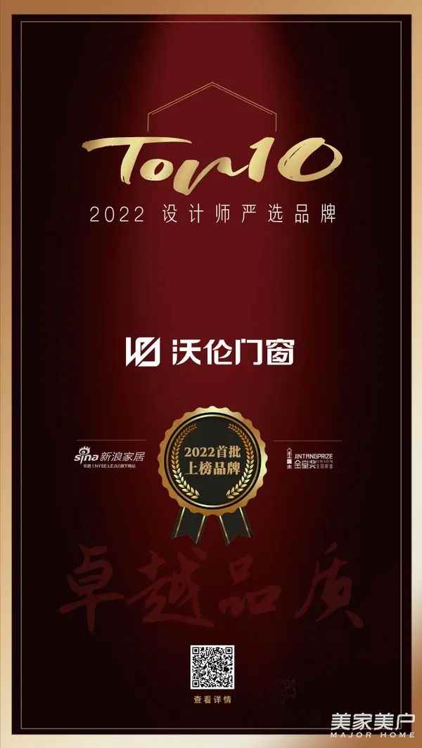 活动汇集国内设计中坚力量,范围覆盖百余城万余设计师,同时数十大咖参与点评。以最强设计师阵容,甄选出服务于设计师及业主的高品质制造品牌。沃伦门窗荣膺「2022 设计师严选品牌TOP10」称号。