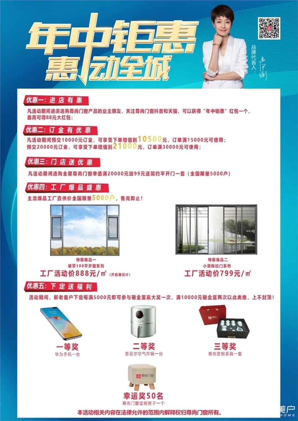 现在到终端门店购买翡翠108平开窗仅需888元/㎡,小资推拉门仅需799元/㎡,让你清凉一夏的门窗,还在考虑什么?活动还在火热进行中,快去选购你心仪的产品带回家吧!
