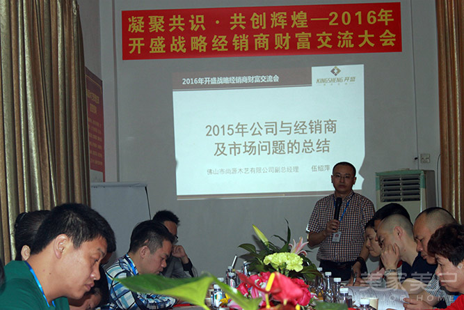 此次会议中,开盛原木生活馆副总经理伍绍萍对2015年公司、经销商及市场问题进行总结,并对2016年公司战略发展方向进行讲解。伍总表示,2016年开盛将狠抓品质,加强开盛整装产品在设计、研发、营销推广等方面的工作,实现公司战略目标。