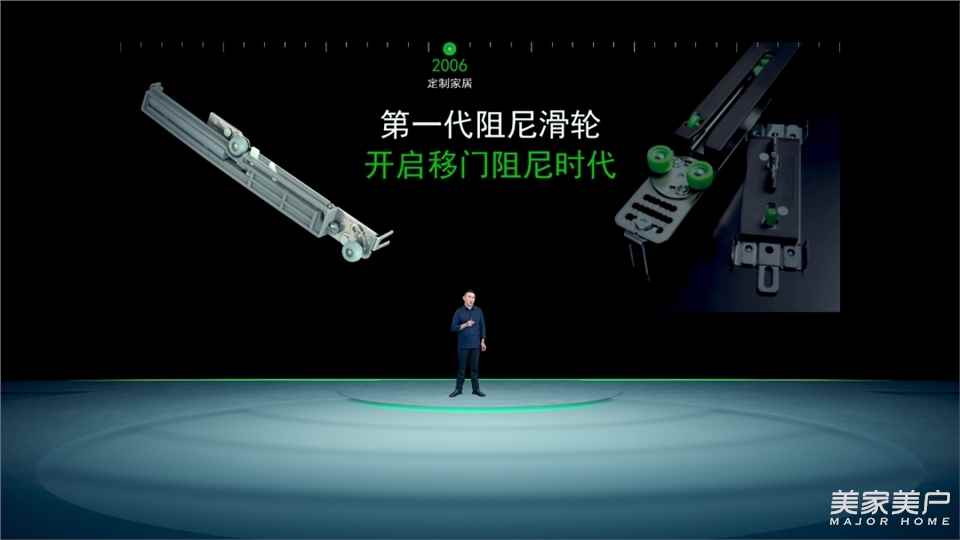 2006年,中国定制家居兴起,许董主导研发了第一代阻尼滑轮,开启了移门阻尼时代。它就像汽车ABS系统一样,让移门具有了刹车功能,解决了当时移门会碰边、反弹、夹手问题,极大提升了移门的安全性与体验感。