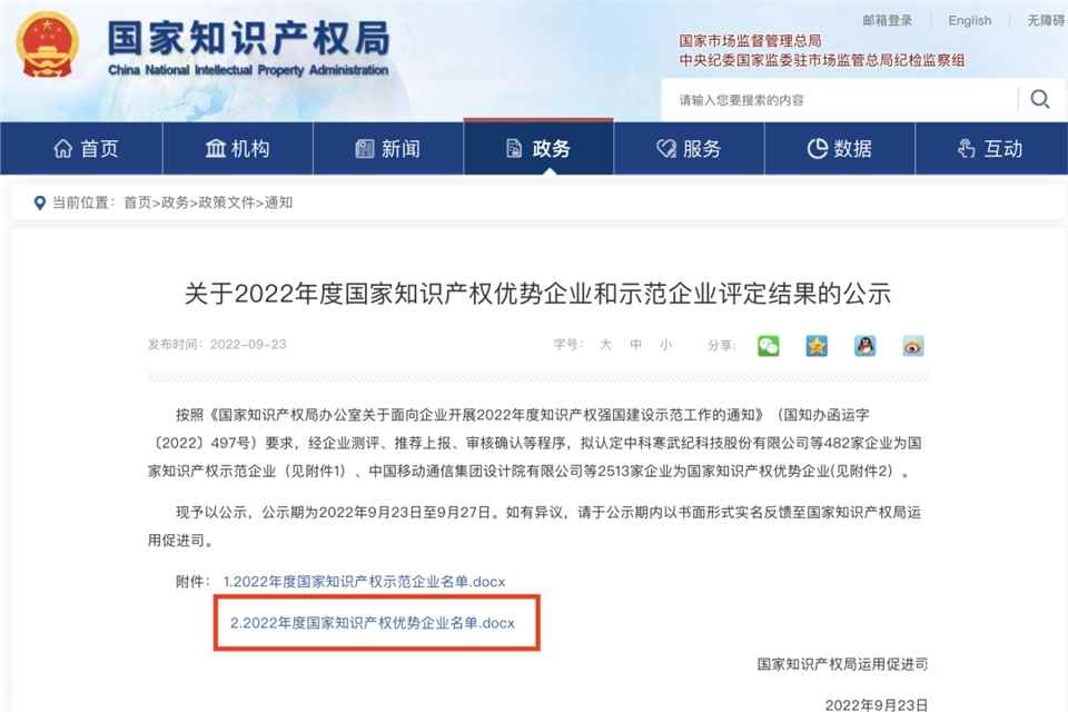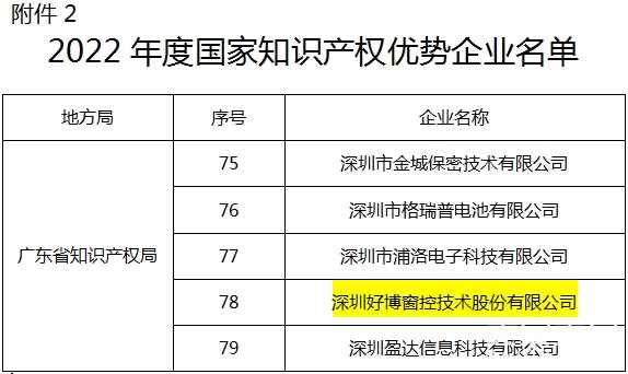 经广东省知识产权局推荐,国家知识产权局审核,并经社会公示,深圳好博窗控技术股份有限公司正式荣获2022年度“国家知识产权优势企业”称号。