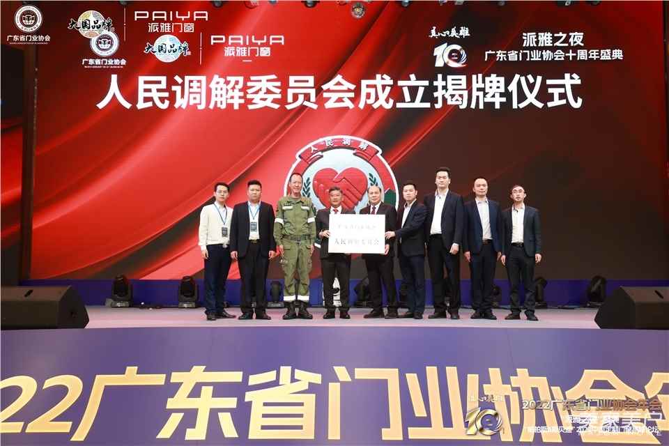 经佛山市南海区司法局研究批准广东省门业协会人民调解委员会的设立及人员组成情况,符合有关条件,同意设立广东省门业协会人民调解委员会。晚宴现场,广东省门业协会人民调解委员会正式揭牌。
