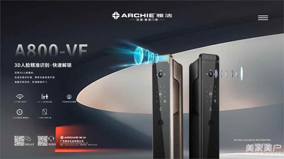 作为国内五金行业领军品牌的企业,雅洁秉承新时代工匠精神,坚持创新发展,深入洞察消费者的需求、不断拓展智能产品体系,旗下智能锁品类多样,如室内指纹锁、入户智能锁等,畅享私人的舒适空间,推出的智能锁M500-FR、A800-VF等新品,融合了3D人脸识别技术、实时监控、多样化的解锁方式等前沿技术功能,受广大消费者喜爱和好评。