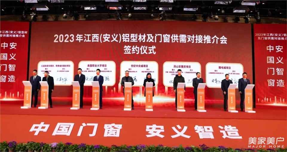 1月29日,2023年江西(安义)铝型材及门窗供需对接推介会在安义门窗特色产业小镇会议中心召开。5个在建项目、10家企业现场签订了供需合作协议,签约面积约83.5万平方米,签约金额高达12.5亿元。市政府副秘书长杨墉富,市住建局副局长熊焕标,县委常委、统战部部长张帆,副县长刘彬出席会议,5家市投资平台企业、8家市特级建筑企业、12家央企国企建筑企业及30家知名房地产以及近百家建筑、门窗及铝型材企业受邀参加会议。
