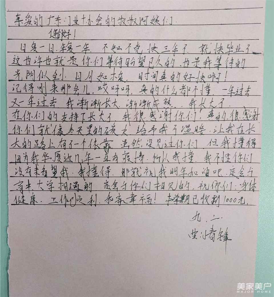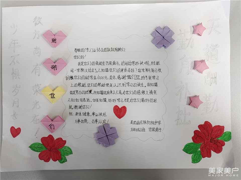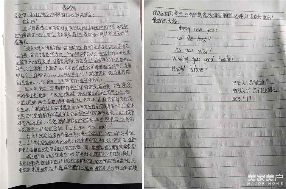 信中,受资助学生们皆表达对各位广东省门业协会爱心人士的善举表示最衷心的感谢,立志以扎实的专业基础、丰富的知识储备、开阔的胸怀格局、优异的学习成绩报答大家的无私奉献,会永远牢记这份大爱,努力成长,步入社会后,也会尽自己所能去帮助需要帮助的人。