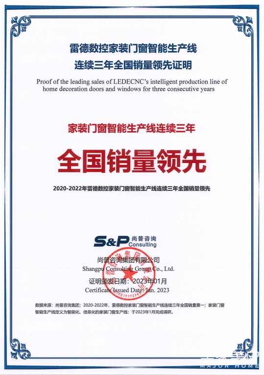 2023年1月,雷德数控荣获由国内权威调研机构认证的“家装门窗智能生产线连续三年全国销量领先”荣誉证明