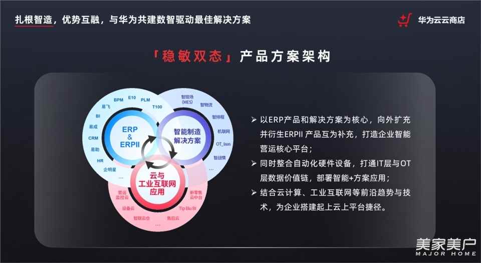 借由深厚的产业知识积淀与企业服务经验,紧扣智能+产业脉动,鼎捷软件不断融合新技术研发新应用,同时重塑与完善价值服务体系,与时俱进推动企业伙伴数字应用效益的落地实现。在稳敏双态IT数智战略下,鼎捷软件以ERP产品和解决方案为核心,向外扩充并衍生ERPII 产品互为补充,打造企业智能营运核心平台;同时整合自动化硬件设备,打通IT层与OT层数据价值链,部署智能+方案应用;结合云计算、工业互联网等前沿趋势与技术,为企业搭建起上云上平台捷径,同步保障成熟业务和对内流程的稳定安全和高效运作及创新业务和对外探索的灵活创新与敏捷迭代。